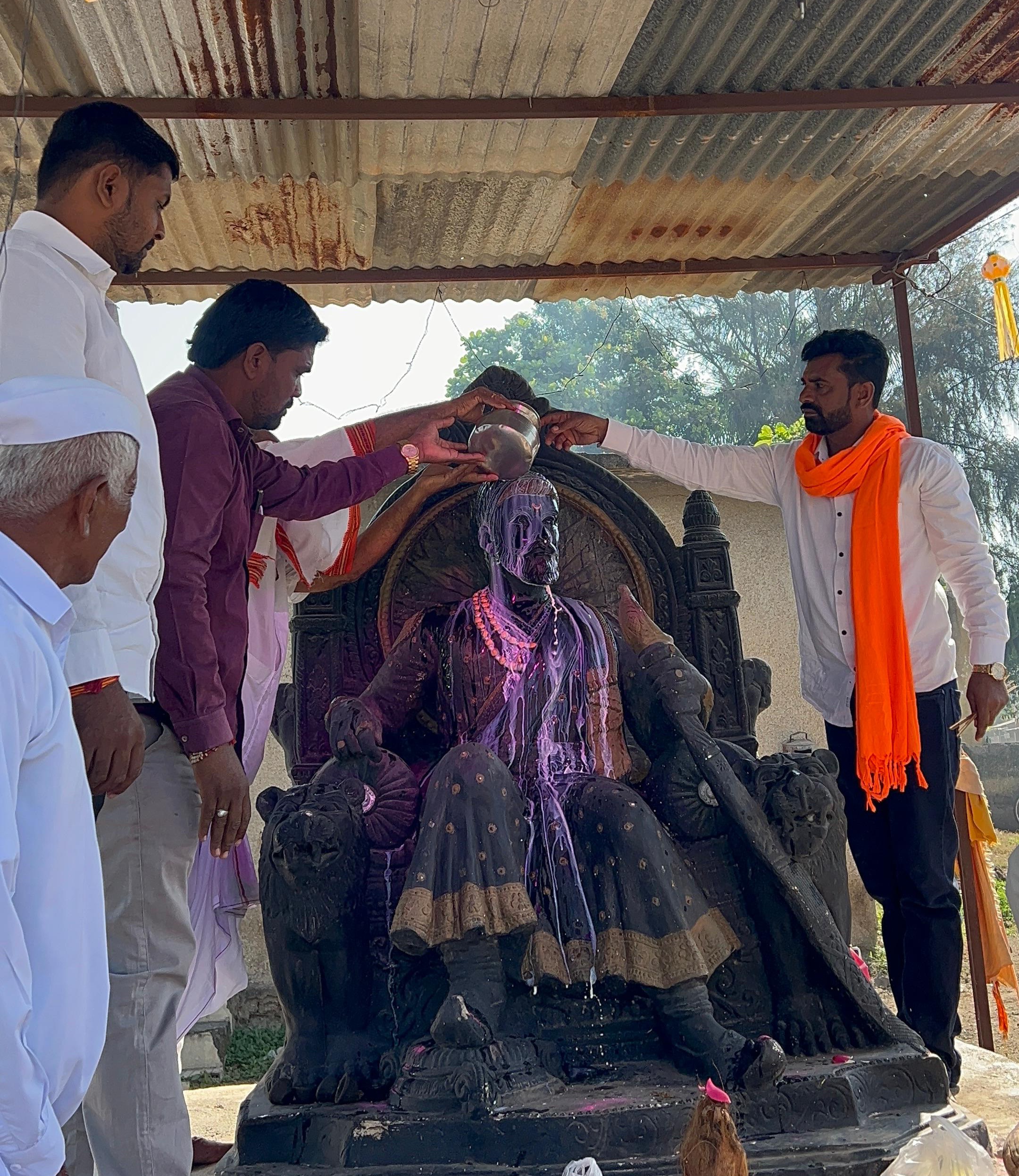 बालाजी देडगाव (प्रतिनिधी)- नेवासा तालुक्यातील बालाजी देडगाव येथे छत्रपती शिवाजी महाराज यांच्या पुर्णाकृती पुतळ्यास छत्रपती प्रतिष्ठानचे अध्यक्ष मच्छिंद्र मुंगसे यांच्या मार्गदर्शनाखाली व हभप सुखदेव महाराज मुंगसे यांच्या शुभहस्ते गंगेच्या पाण्याने स्नान व दुग्धभिषेक घालण्यात आला.यावेळी देवा तांदळे यांच्या वेदमंत्राच्या साह्याने विधिवत पूजा करण्यात आली. पूजेसाठी हभप सुखदेव महाराज मुंगसे यांना मान देण्यात आला होता तर शिवसैनिकांच्या उपस्थितीत महाआरतीचे आयोजन करण्यात आले होते.