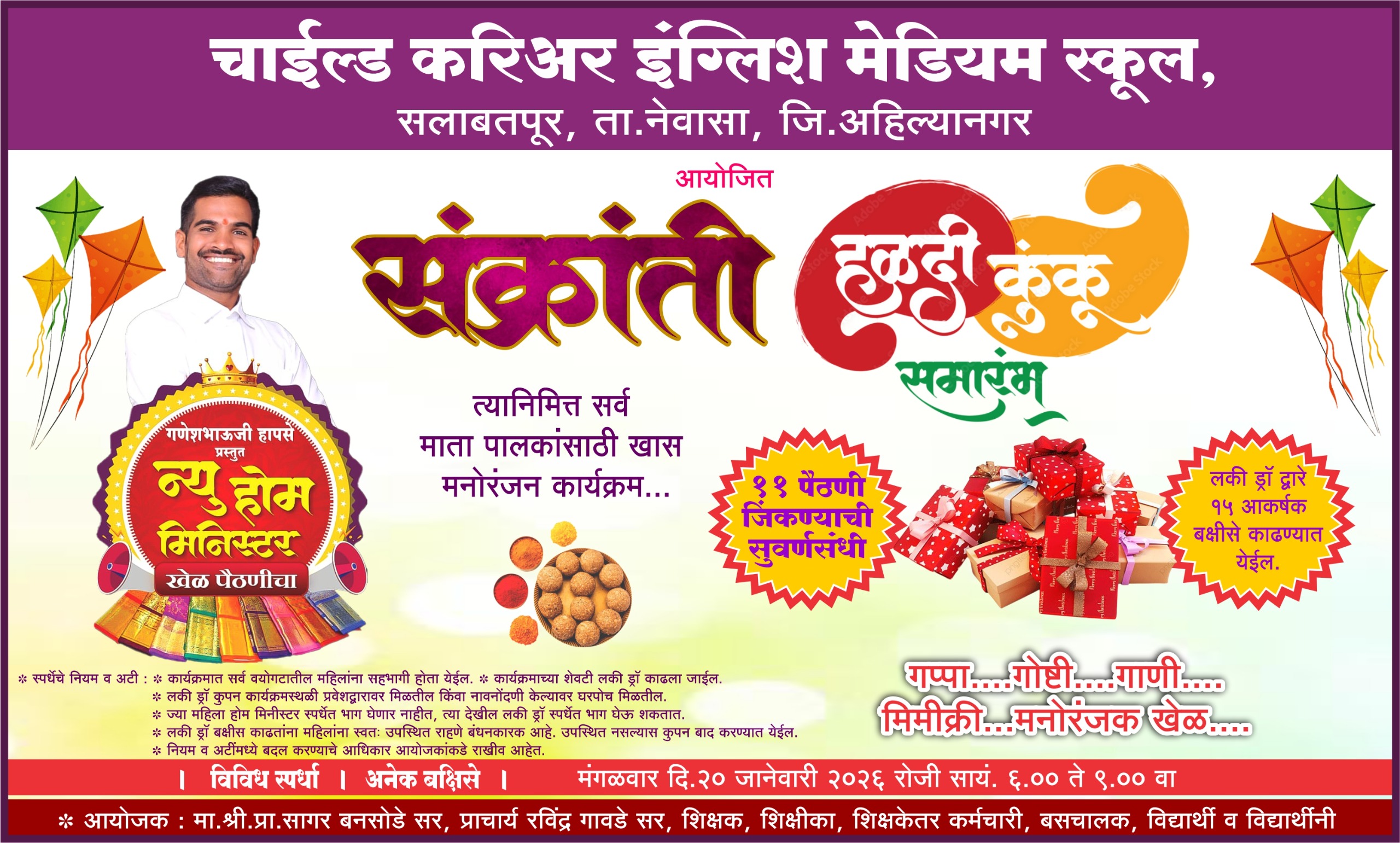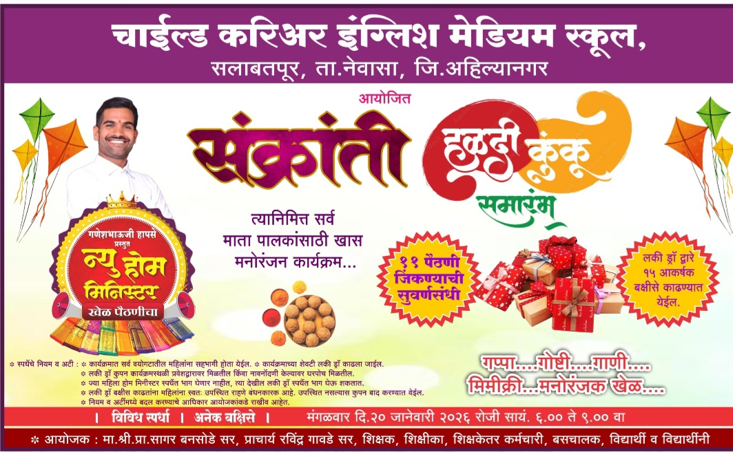 बालाजी देडगाव (प्रतिनिधी)- चाइल्ड करिअर इंग्लिश मीडियम स्कूल मध्ये”मकर संक्रातीचा उत्सव” हळदी कुंकवाच्या साथीने न्यू होम मिनिस्टर च्या रंगतदार कार्यक्रमाचे आयोजन. नेवासा तालुक्यातील सलाबतपुर येथील नामांकित गुणवत्ता,संस्कार व संस्कृती जपणारे शाळा म्हणून नावाजलेली चाइल्ड करिअर इंग्लिश मीडियम स्कूल अँड ज्युनिअर कॉलेज मध्ये खास मकर संक्रांतीनिमित्त सलाबतपुर परिसरामध्ये प्रथमच प्रसिद्ध निवेदक गणेश भाऊ हापसे प्रस्तुत न्यू […]