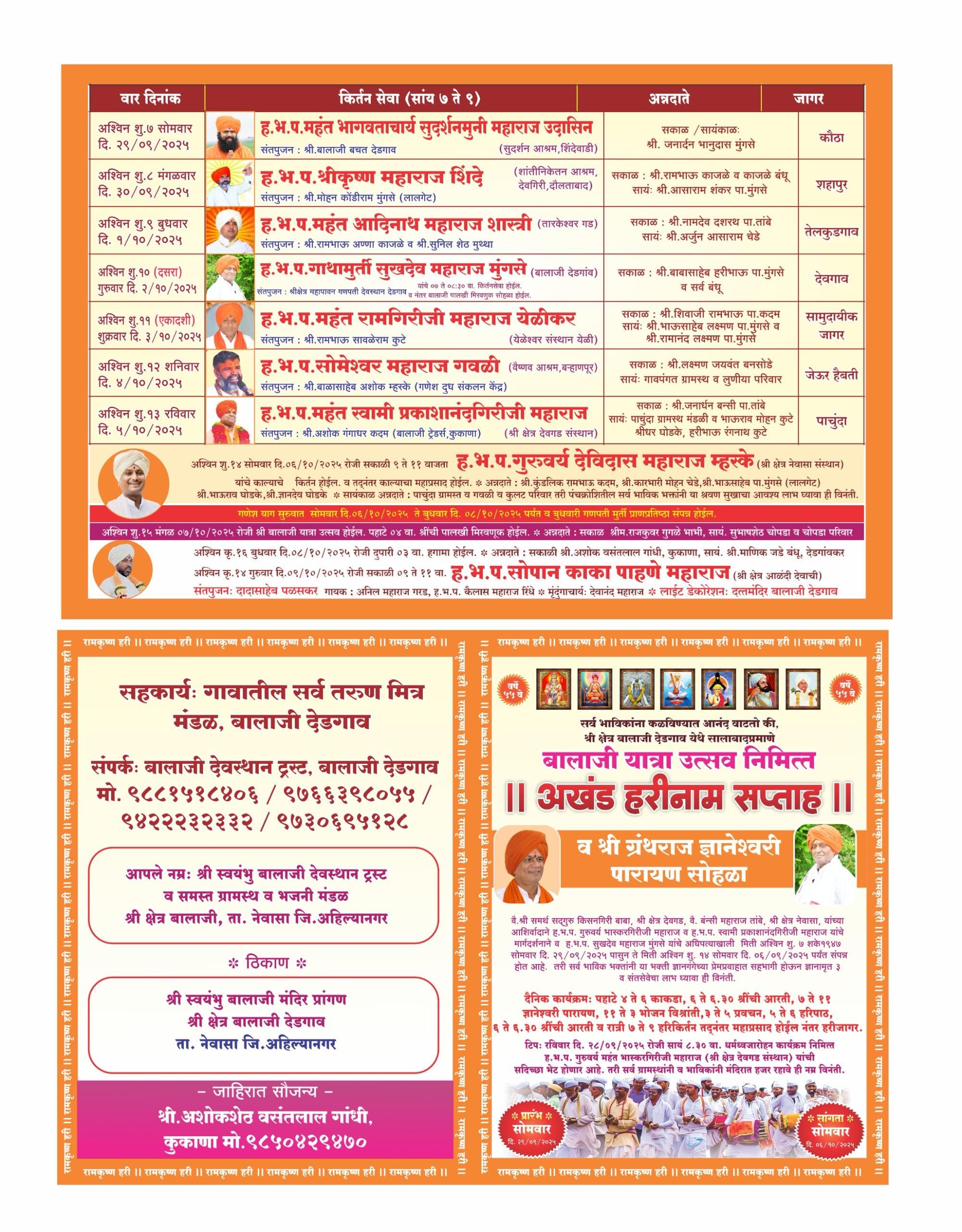 बालाजी देडगाव (प्रतिनिधी)- नेवासा तालुक्यातील बालाजी देडगाव येथे वै. श्री समर्थ सदगुरु किसनगिरी बाबा, वै. बन्सी महाराज तांबे यांच्या आशिर्वादाने व हभप गुरुवर्य भास्करगिरीजी महाराज व हभप स्वामी प्रकाशनंदगिरीजी महाराज यांचे मार्गदर्शनाने व हभप सुखदेव महाराज मुंगसे यांच्या अधिपत्याखाली बालाजी यात्रा उत्सवानिमित्त अखंड हरिनाम सप्ताहाचे आयोजन करण्यात आले आहे. या सोहळ्याचे उद्घाटन धर्मध्वजारोहणने करण्यात आली. या सप्ताहनिमित्ताने गुरुवर्य भास्करगिरीजी महाराज यांनी सदिच्छा भेट दिली. सोमवार दि. २९ सप्टेंबर ते सोमवार दि.६ ऑक्टोबर या कालावधित या अखंड हरिनाम सप्ताहाचे आयोजन करण्यात आले आहे.