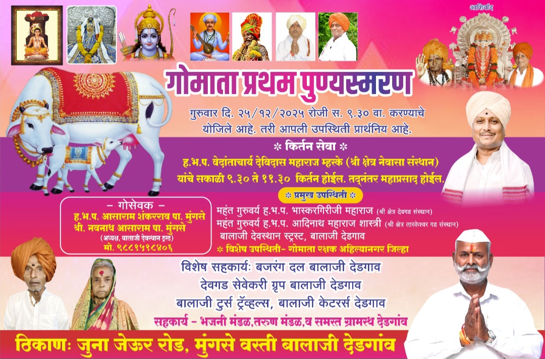बालाजी देडगाव (प्रतिनिधी)- नेवासा तालुक्यातील बालाजी देडगाव येथे उद्या (दि.२५) सकाळी ९.३० वाजता गोमाता प्रथम पुण्यस्मरण कार्यक्रमाचे आयोजन करण्यात आले आहे. जुना जेऊर रोड, मुंगसे वस्ती येथे होणाऱ्या या कार्यक्रमानिमित्त हभप वेदांताचार्य देविदास महाराज म्हस्के (श्री क्षेत्र नेवासा संस्थान) यांचे सकाळी ९.३० ते ११.३० कीर्तन होणार आहे. त्यानंतर महाप्रसाद होईल. यावेळी महंत गुरुवर्य हभप भास्करगिरीजी महाराज (श्री क्षेत्र देवगड संस्थान), महंत गुरुवर्य आदिनाथ महाराज शास्त्री (श्री क्षेत्र तारकेश्वर गड संस्थान) यांची प्रमुख उपस्थिती लाभणार आहे. या कार्यक्रमासाठी गोमाता रक्षक अहिल्यानगर जिल्हा यांची विशेष उपस्थित राहणार आहे. या कार्यक्रमासाठी बालाजी देवस्थान ट्रस्ट, बजरंग दल, बालाजी देडगाव, देवगड सेवेकरी ग्रुप बालाजी देडगाव, बालाजी टूर्स ट्रॅव्हल्स, बालाजी केटरर्स देडगाव, भजनी मंडळ, तरुण मंडळ व ग्रामस्थ बालाजी देडगाव यांचे विशेष सहकार्य लाभणार आहे. या कार्यक्रमासाठी मोठ्या संख्येने उपस्थित राहण्याचे आवाहन गोसेवक हभप आसाराम शंकरराव मुंगसे पाटील, बालाजी देवस्थानचे अध्यक्ष नवनाथ आसाराम मुंगसे पाटील यांनी केले आहे.