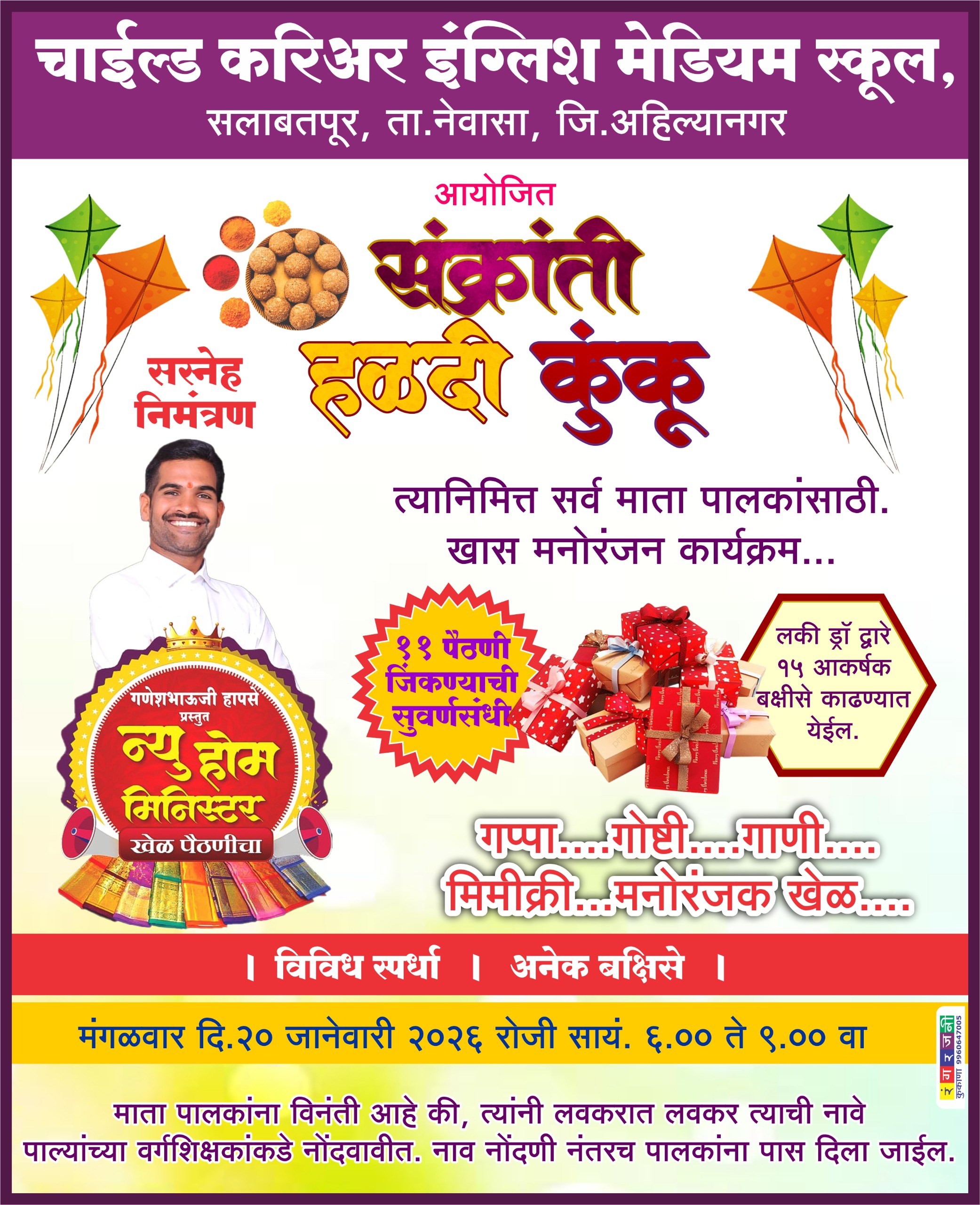 नेवासा तालुक्यातील सलाबतपुर येथील नामांकित गुणवत्ता,संस्कार व संस्कृती जपणारे शाळा म्हणून नावाजलेली चाइल्ड करिअर इंग्लिश मीडियम स्कूल अँड ज्युनिअर कॉलेज मध्ये खास मकर संक्रांतीनिमित्त सलाबतपुर परिसरामध्ये प्रथमच प्रसिद्ध निवेदक गणेश भाऊ हापसे प्रस्तुत न्यू होम मिनिस्टर सोबतच “संक्रातीचा वाण आणि पैठणीचा मान”सोबतच भव्य हळदी-कुंकू समारंभ मंगळवार 20 जानेवारी 2026 रोजी सायंकाळी ठीक 6 वाजता आयोजित करण्यात आलेला आहे.