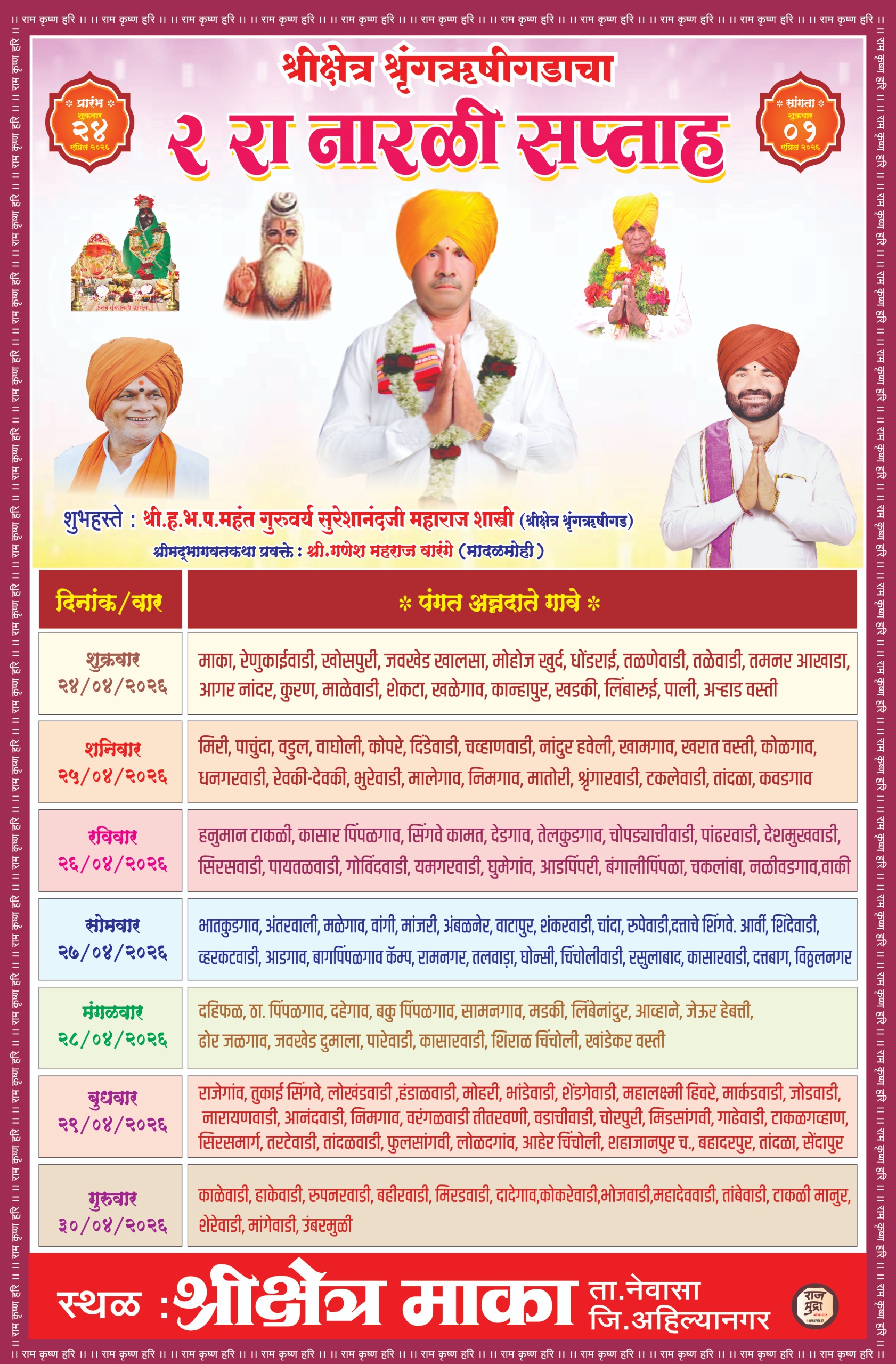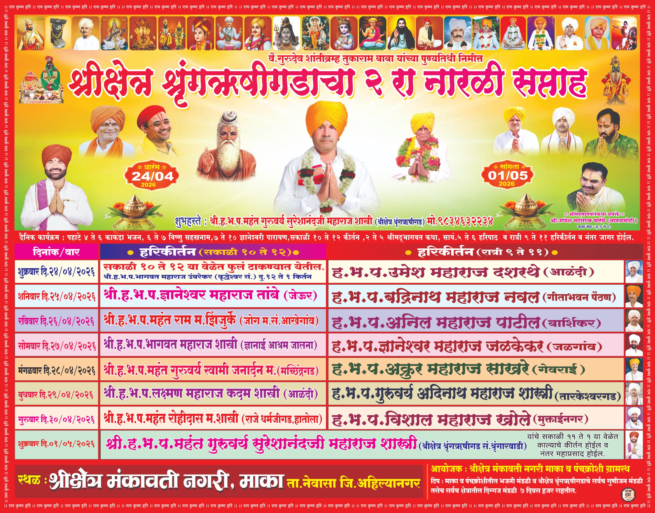 बालाजी देडगाव (प्रतिनिधी)- नेवासा तालुक्यातील माका येथे वै. गुरुदेव शांतीब्रम्ह तुकाराम बाबांच्या पुण्यतिथीनिमित्त हभप महंत गुरुवर्य सुरेशानंदजी महाराज शास्त्री (श्री क्षेत्र श्रृंगऋषीगड) बाबांच्या शुभहस्ते आयोजित श्री क्षेत्र श्रृंगॠषीगडाचा दुसऱ्या नारळी सप्ताहास उद्यापासून (ता.२४) मोठ्या उत्साहात व भक्तिभावाने सुरूवात होत आहे. दि. २४ एप्रिल ते १ मे २०२६ दरम्यान चालणाऱ्या या सप्ताहात विविध धार्मिक कार्यक्रमांची रेलचेल पाहायला मिळणार आहे.